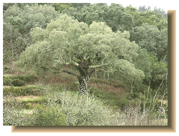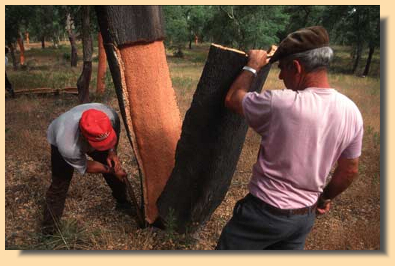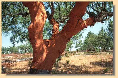 Die Korkeiche ist ein immergrüner Baum mit einer reichverzweigten Krone und sehr dicker Rinde. Bereits seit dem Altertum wird dieser Baum als Korklieferant genutzt. Er erzeugt nach 15 - 20 Jahren einen brüchigen sogenannten männlichen Kork, der wegen seiner geringen Elastizität nicht brauchbar ist. Dieser wird vorsichtig abgeschält, um die darunterliegenden Gewebe nicht zu verletzen. Darauf beginnt die Bildung neuer Korkschichten, die in 10 Jahren bis zu 10 cm Dicke erreichen. So entsteht der sogenannte weibliche Kork, der alle 10 - 12 Jahre abgehoben werden kann. Dies kann wiederholt werden, bis die Bäume etwa 150 Jahre alt sind. Kork ist ein einzigartiges biologisches Material, das ein sehr geringes spezifisches Gewicht und eine grosse Elastizität besitzt. |